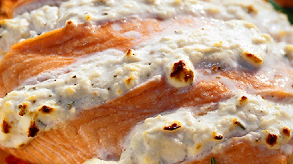 2. Sekoita raejuusto, Philadelphia-juusto, suola ja pippuri. Täytä viillot juustoseoksella ja levitä loput kalan päälle.