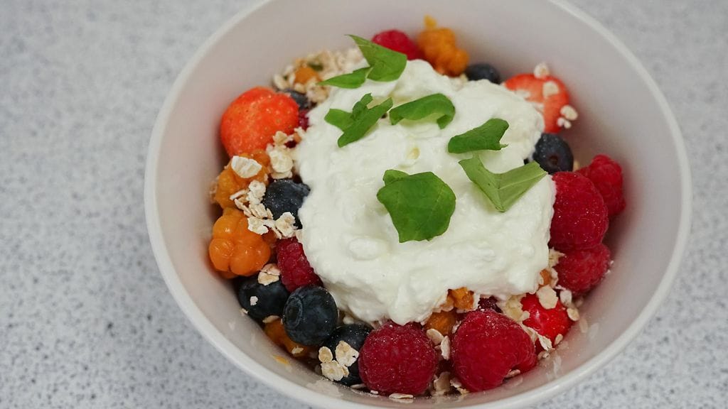 - Ota kulho ja laita pohjalle jogurttia. Nosta tämän jälkeen vuorotellen päällekkäin kaurahiutaleita ja marjoja. Laita väleihin myös minttua.