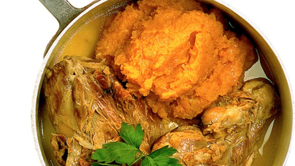 3. Kuori lanttu, porkkanat ja perunat ja leikkaa ne hieman pienemmiksi paloiksi. Laita ne pataan 35 minuutin jälkeen. Anna kiehua hiljaa vielä 45 minuuttia. Nosta lihat kattilasta ja pidä lämpimänä. Nosta sipuli ja mausteet kattilasta. Kaada juurekset lävikköön, säästä liemi. Muussaa juurekset, mutta älä aivan hienoksi. Lisää lientä jotta saat haluamasi koostumuksen. Lisää hieman voita, mausta suolalla ja pippurilla. Tarjoile juuresmuussi lihan kanssa.