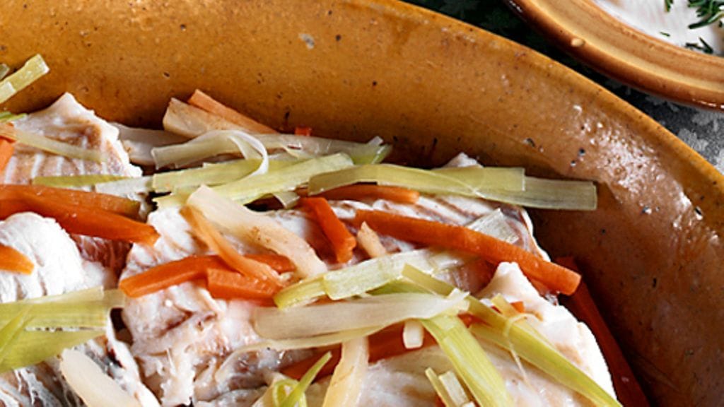 4. Kääntele vihannekset nopeasti voissa lämpimiksi, asettele turskan päälle. Tarjoile kastikkeen kera.