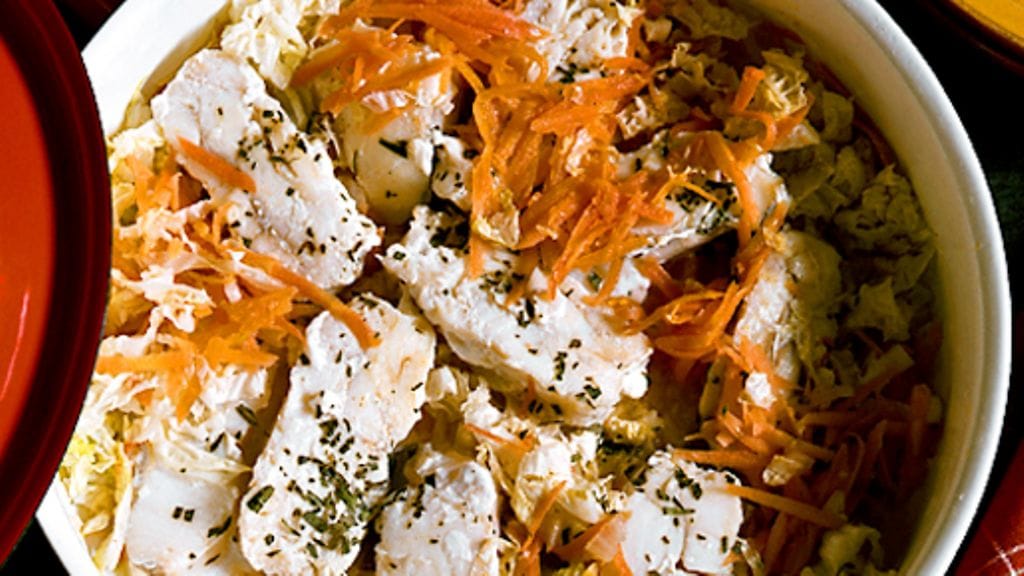 1. Laita salaattikiinankaali ja porkkana paistokasarin pohjalle. Peitä kalapaloilla ja mausta. Murusta mukaan liemikuutio, lisää vesi.