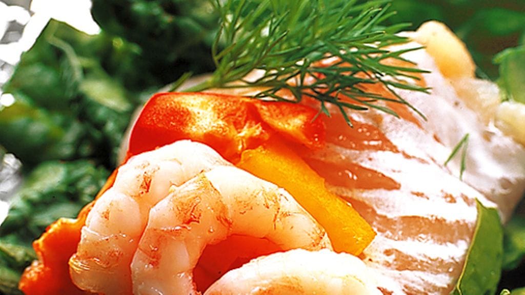 1. Aseta foliopalan päälle tuoreita pinaatinlehtiä, niissä saa mielellään olla hieman huuhteluvettä. Lisää kalaa, katkarapuja ja paprikasuikaleita. Päällimmäiseksi nokare voita, suolaa ja pippuria.