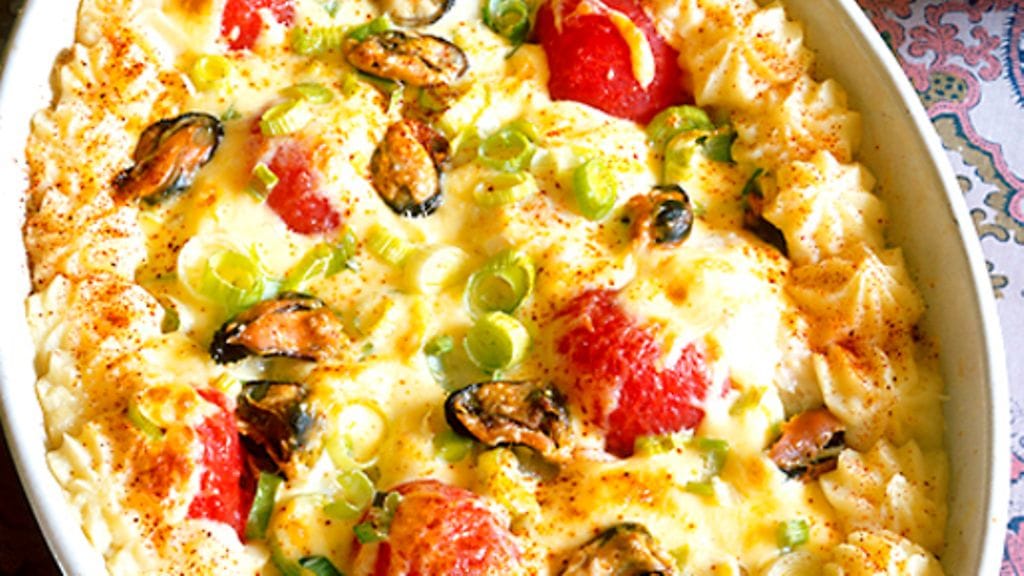 2. Peitä kala halkaistuilla tomaateilla purjoviipaleilla ja valutetuilla simpukoilla.