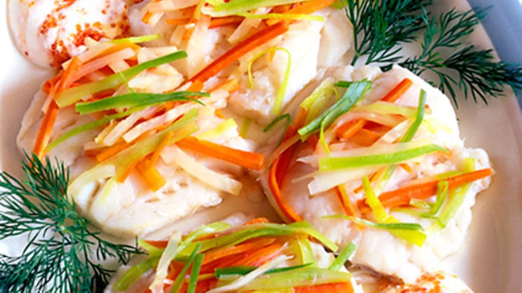 3. Suolaa kalafileet. Ripota päälle tillisilppua ja taivuta fileet löysiksi kääröiksi. Pane ne voideltuun kasariin ja keitä miedolla lämmöllä 5-7 minuuttia. Ripottele vihannessuikaleet kalojen päälle ja tuo tarjolle kastikkeen kanssa.