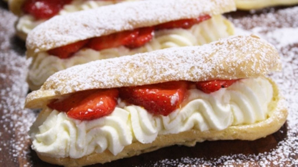 Anna tuulihattujen jäähtyä kunnolla ennen täyttämistä. Halkaise tuulihatut pitkittäin ja pursota täyte niiden sisään. Lado täytteen päälle marinoidut mansikkasiivut.