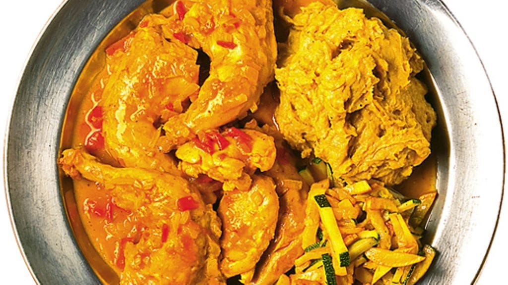 1. Leikkaa broileri neljään osaan ja poista nahka. Laita jauho lautaselle ja pyörittele broilerinpalat siinä kauttaaltaan, mausta sitten suolalla ja pippurilla. Kuori ja silppua sipuli ja lohko tomaatit. Kuumenna öljy padassa ja paista broileripaloja, kunnes ne ovat kauttaaltaan kullanruskeita. Lisää sipulisilppu ja curry, ruskista minuutin verran. Lisää tomaattilohkot ja kaada sekaan kanaliemi. Sulje kansi ja keittele 30-40 minuuttia, kunnes broileri tuntuu kypsältä.
