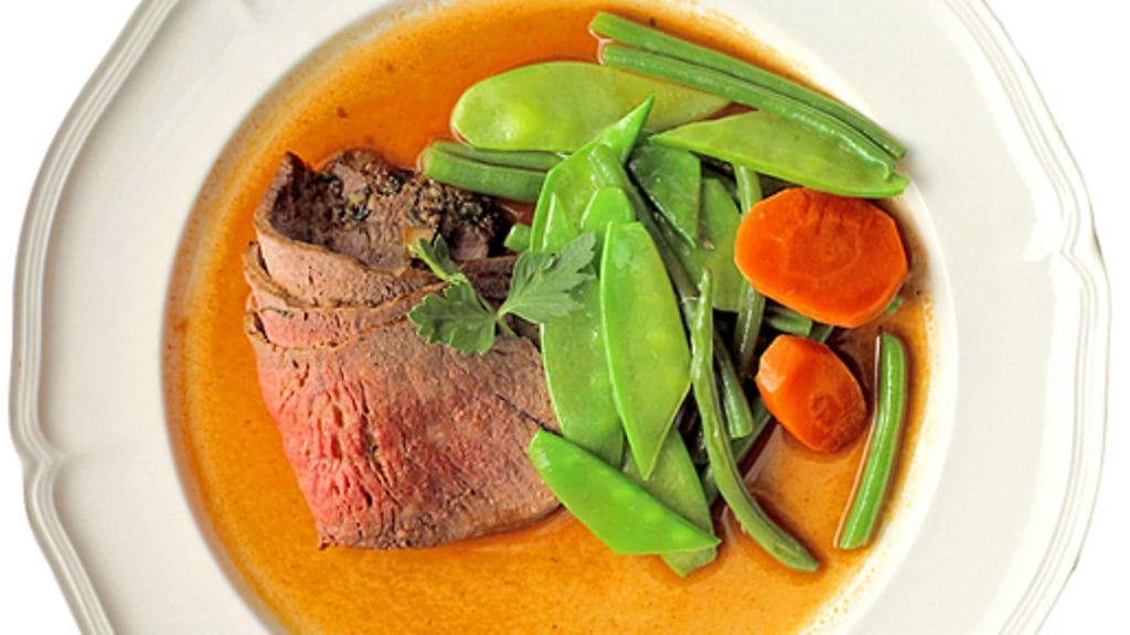 1. Kuumenna uuni 175 asteeseen. Poista lihasta jänteet ja rasva. Ruskista liha kauttaaltaan voissa ja mausta suolalla ja pippurilla. Jatka kypsentämistä uunissa, kunnes sisälämpötila on 65-70 astetta. Viipaloi liha juuri ennen tarjoilua.
