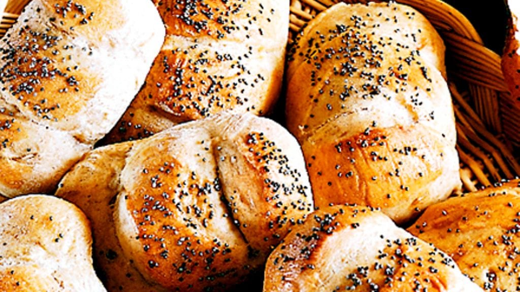 3. Kuumenna uuni 250 asteeseen. Penslaa sämpylät vatkatulla munalla ja sirota unikonsiemeniä niiden pinnalle. Paista uunin keskitasolla 10-12 minuuttia. Jäähdytä ritilän päällä.