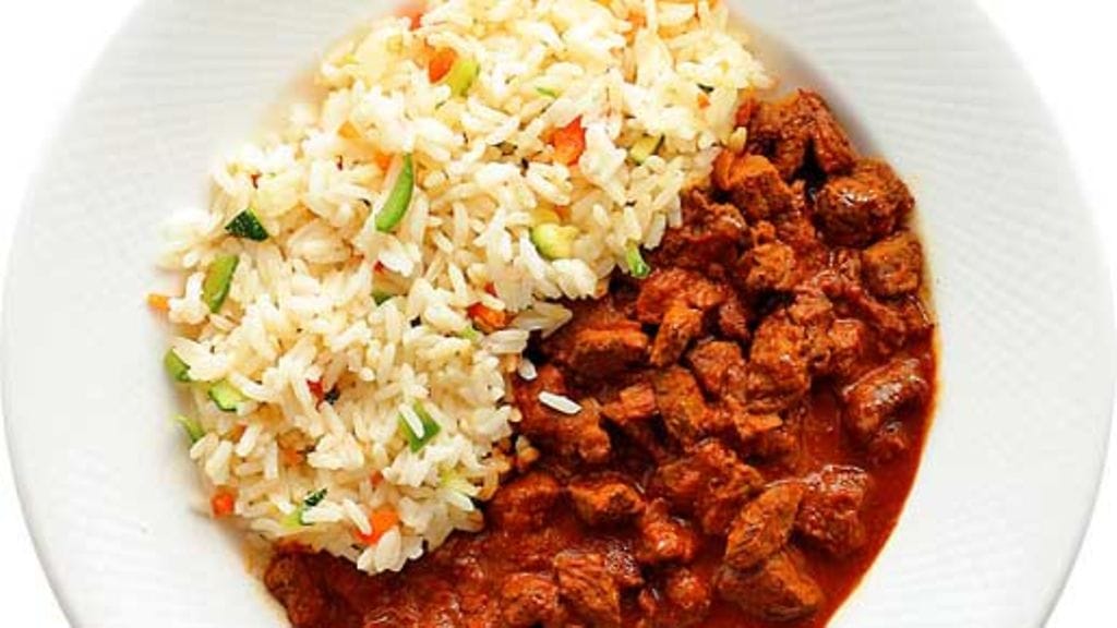 2. Mausta lihakuutiot suolalla ja pippurilla ja ruskista ne paistinpannulla. Kun lihakuutiot ovat kauniin ruskeita, siirrä ne pataan. Kuullota sipuli ja valkosipuli paistinpannulla yhdessä tomaattipyreen kanssa ja siirrä sitten pataan. Ripottele päälle paprikajauhe ja sekoita. Kaada joukkoon lihaliemi ja jätä pata hautumaan tunniksi.