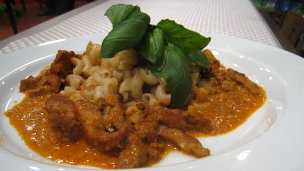 Lisää lihaliemikuutiot ja vettä sen verran, että ainekset peittyvät. Hauduta kunnes lihasuikaleet ovat pehmenneet ja sipuli suurustanut kastikkeen. Aikaa kuluu vajaan tunnin verran. Lisää vielä lopuksi smetana. Keitä lisäkkeeksi makaronia, riisiä tai perunoita.