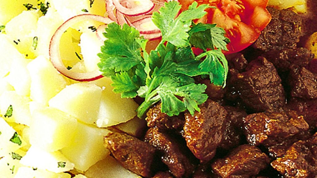 2. Lisää lihat pataan ja mausta suolalla, paprikajauheella ja kuminalla. Kaada päälle liemi ja kuumenna kiehuvaksi. Anna padan kiehua 35 minuuttia.