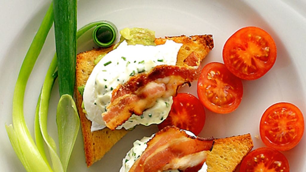 1. Uppomunat: Kaada vesi matalaan, avaraan kattilaan, kiehauta ja lisää suola ja etikka. Alenna lämpöä niin, että vesi on juuri kiehumispisteessä. Riko kananmuna kuppiin ja anna sen valua hitaasti veteen. Heti valkuaisen hyydyttyä muna on valmis. Tähän menee noin 3 minuuttia. Nosta muna reikäkauhalla kattilasta ja valuta.