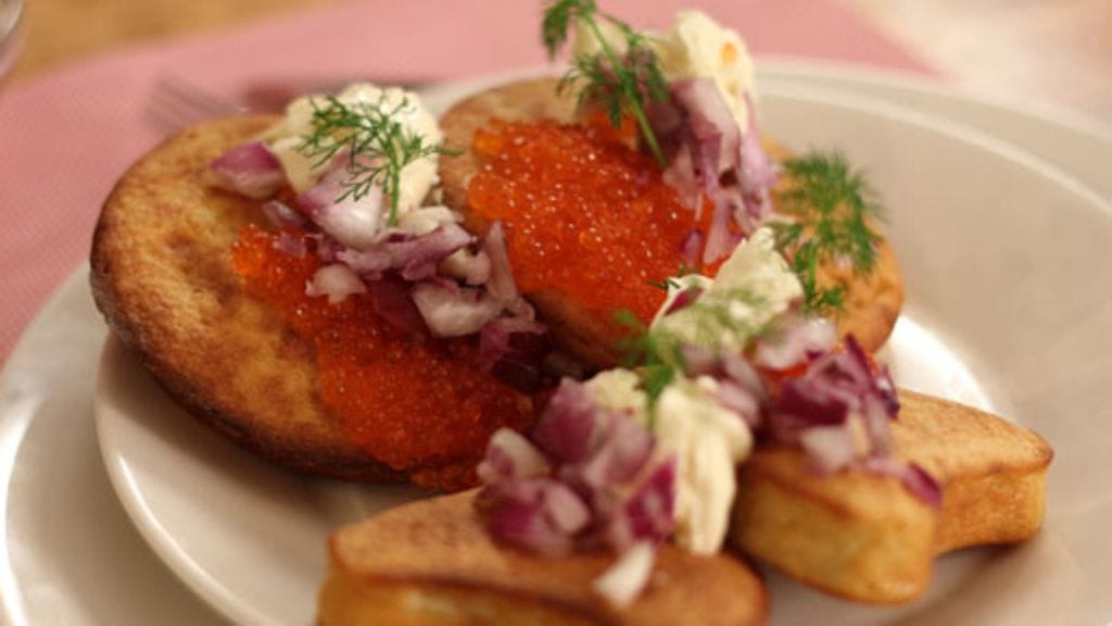 Blinien kanssa tarjotaan mätiä, smetanaa ja sipulia, myös graavi- tai kylmäsavustettu lohi sopii hyvin.