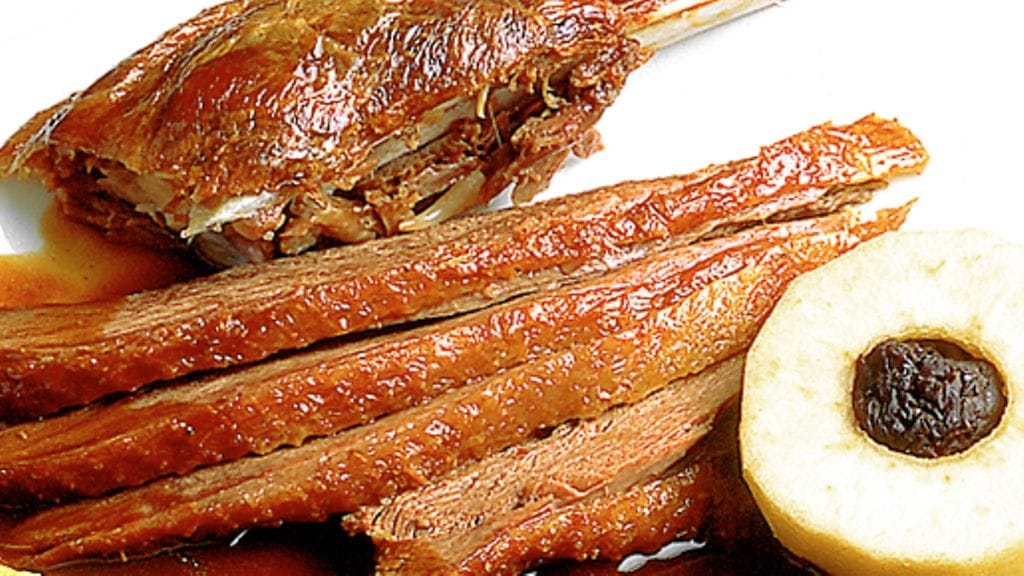 2. Laita hanhi toinen koipi ylöspäin ritilälle uunipannun päälle, kaada pellille 3 dl vettä. Laita uuniin ja paista lintua 30-40 minuuttia kummaltakin koipipuolelta, ja vielä yhtä pitkään rintapuoli ylöspäin. Yhteensä paistoaika on n. 2-2 ½ tuntia. Valele lintua välillä rasvalla, joka valuu uunipannulle. Paistamisen loppua kohti poista paistoliemi, säästä se ja korvaa se muutamalla ruokalusikallisella kylmää vettä. Valele lintua vedellä ja anna uuninluukun olla raollaan viimeiset 20 minuuttia jolloin nahasta tulee erityisen rapea. Ota lintu uunista, leikkaa rinta- ja koipipalat irti ja säästä rapea nahka tarjoiluun. Siivilöi paistinliemi ja kuori pois rasva pinnalta.