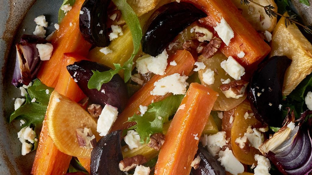 - Paahda ensin punajuuret uunissa 200 asteessa 10 minuuttia. Lisää juuripersiljat ja paista 5 min lisää. Lisää viimeisenä porkkanat ja paahda vielä 20-30 min. Kokeile haarukalla, että kaikki juurekset ovat pehmeitä.
