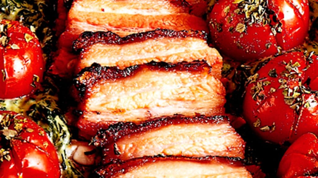 2. Paista uunin keskitasolla, kunnes mittari näyttää 85 astetta. Penslaa lihaa paistamisen loppupuolella veteen sekoitetulla siirapilla. Leikkaa risti tomaattien päähän, sirota päälle vähän suolaa ja oreganoa ja laita mukaan paistumaan viimeiseksi 20 minuutiksi.