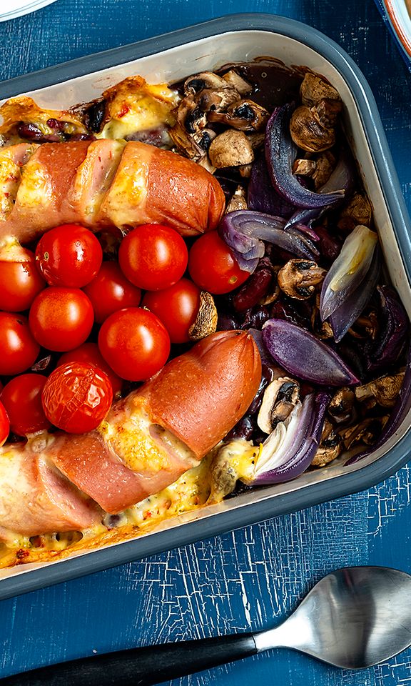 - Poista lenkkimakkarasta kuori ja laita se makkarat uunivuokaan. Leikkaa makkaraan viiltoja.