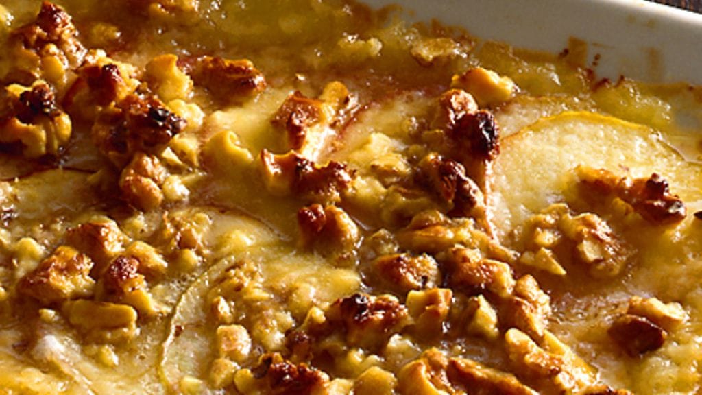 1. Kuumenna uuni 225 asteeseen. Viipaloi omenat ohuesti ja laita ne uuninkestävään, voideltuun vuokaan. Ripottele päälle kanelia ja rouhittuja pähkinöitä.
