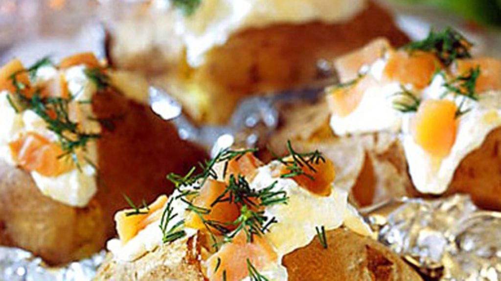 2. Sekoita täyte ja mausta sitruunankuorella. Paina perunoita sivuilta niin että risti aukeaa ja lisää täyte. Koristele halutessasi lohikuutioilla.