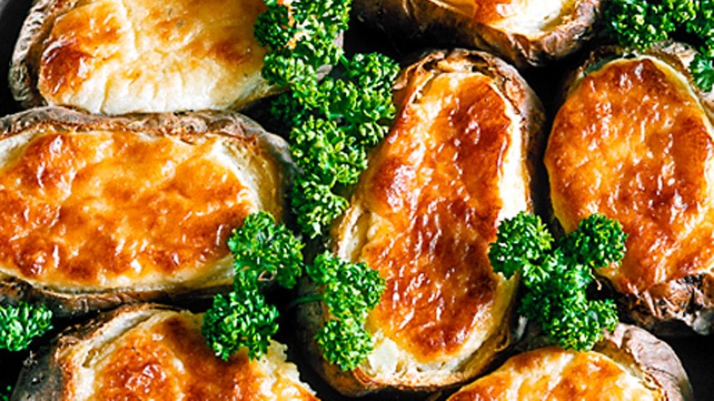 5. Täytä perunat ja gratinoi 250 asteessa kunnes pinta on saanut väriä.