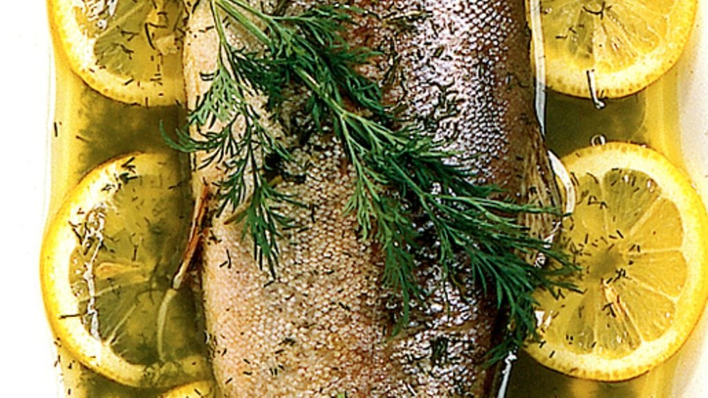 3. Nostele kalapalat syvälle vadille tai vuokaan. Siivilöi keitinliemi kattilaan, kuumenna kiehuvaksi ja lisää tilli. Kaada sitten liemi kalojen päälle ja asettele sitruunaviipaleet ympärille. Anna jäähtyä ja laita kala jääkaappiin muutamaksi tunniksi ennen tarjoilua.