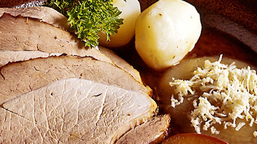1. Kuumenna uuni 200 asteeseen. Mausta liha ja laita se uunivuokaan, pistä siihen paistolämpömittari. Kaada liemi vuokaan.