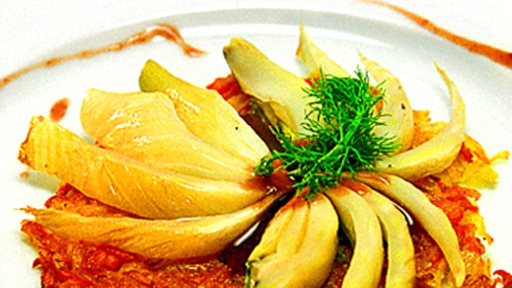 1. Kuumenna uuni 225 asteeseen. Leikkaa fenkoleista varret. Leikkaa fenkolit puolen sentin kokoisiksi viipaleiksi. Voitele uuninkestävä vuoka ja laita viipaleet vuokaan. Viipaloi valkosipuli ja lisää vuokaan. Laita päälle voinokareita. Kaada päälle vermutti (tai viini tai vesi). Mausta suolalla ja pippurilla, sekoita. Rypistä ja kostuta voipaperi ja peitä fenkolit sillä. Paista uunissa 30-40 minuuttia.