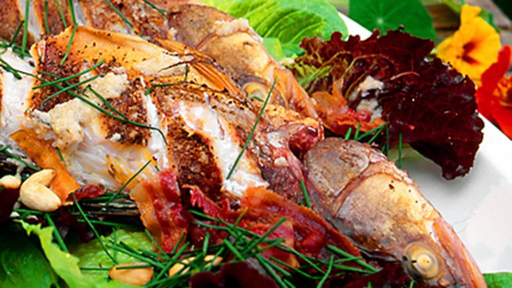 3. Aseta kala salaattipedille, ripottele päälle pinjansiemeniä.