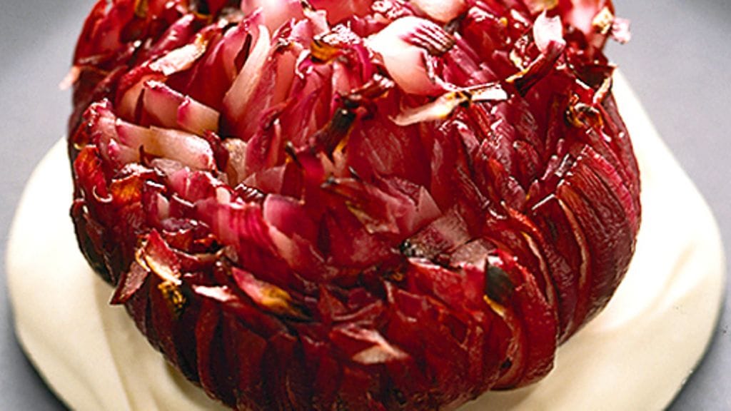 1. Kuumenna uuni 225 asteeseen. Kuori sipulit, laita ne kanta alaspäin leikkuulaudalle ja leikkaa halki lähes alas asti ristiviillolla terävällä veitsellä.