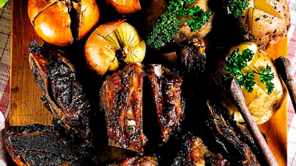 2. Pese ja harjaa perunat huolella, mutta älä kuori. Kuori sipulit, mutta jätä ne kokonaisiksi. Leikkaa risti perunoihin ja sipuleihin ja laita ne ympäriinsä uunipannulle. Paista uunin keskitasolla noin 1,5 tuntia. Voitele ja käännä luita pari kertaa.