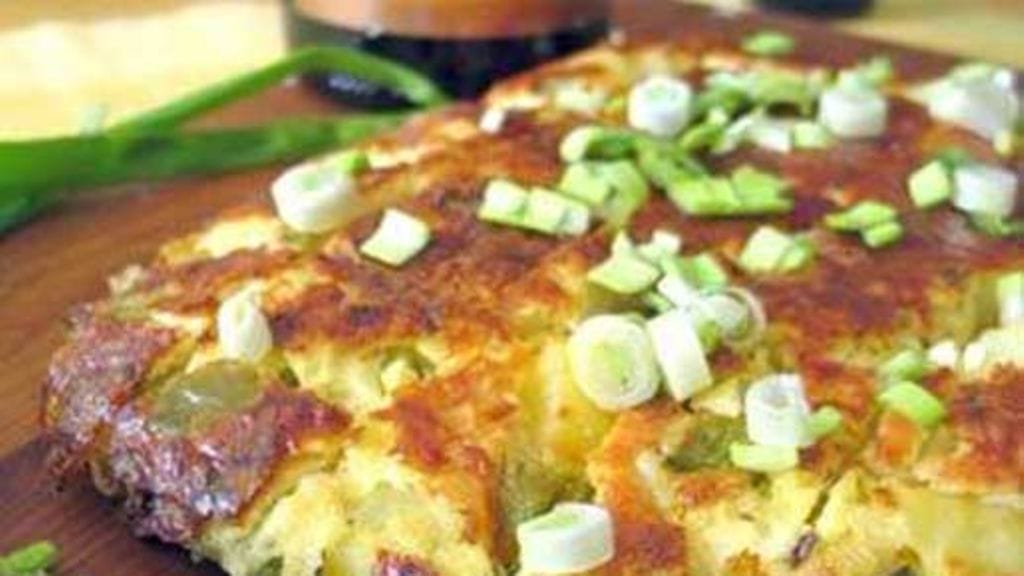 Paista uunissa 30–40 minuuttia, kunnes seos on kullanruskea, kohonnut ja keskeltä hyytynyt. Anna jäähtyä. Kumoa tortilla ruskistunut puoli ylöspäin leikkuu laudalle ja irrota folio. Anna jäähtyä täysin. Leikkaa pieniksi neliöiksi ja tarjoile cocktailtikkujen kera tai kiinnitä palat leipäviipaleeseen.