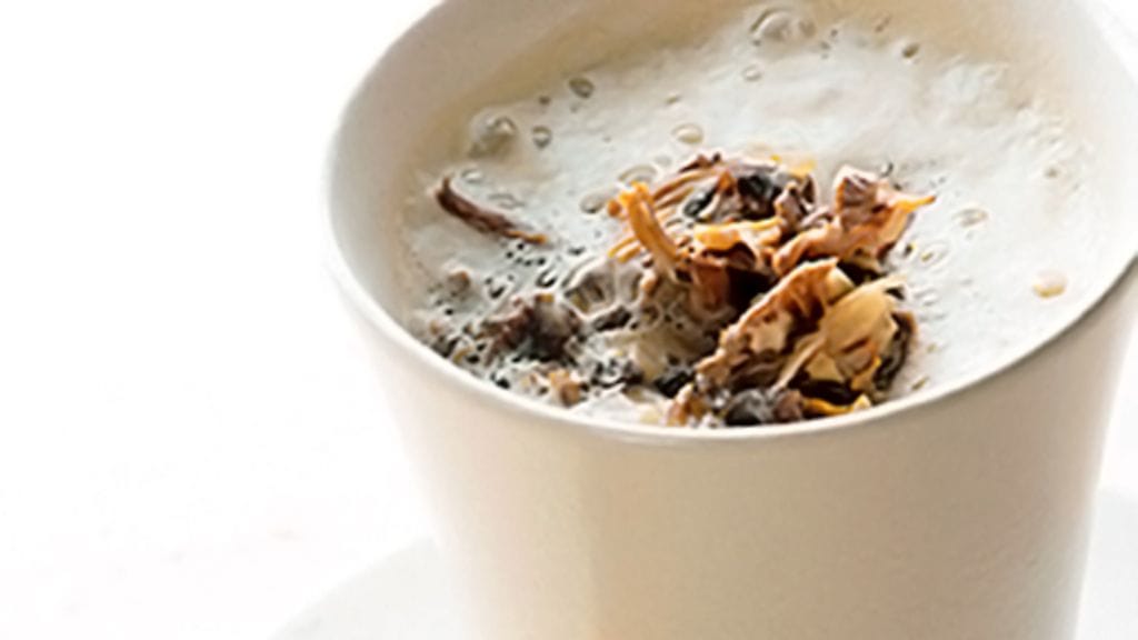 3. Soseuta keitto sauvasekoittimella kattilassa. Nosta keittoa annoskulhoihin, ripota jokaiseen annokseen sipuli-sienihaketta ja tarjoile heti leivän ja murustellun sinihomejuuston kanssa.