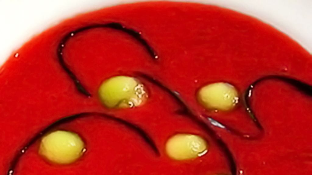 2. Koverra melonista palloja palloraudalla tai leikkaa melonin malto kuutioiksi. Suikaloi muutamia ohuita kurkunkuorisuikaleita kuorimaveitsellä. Koristele keitto melonipalloilla ja kurkunkuorisuikaleilla.