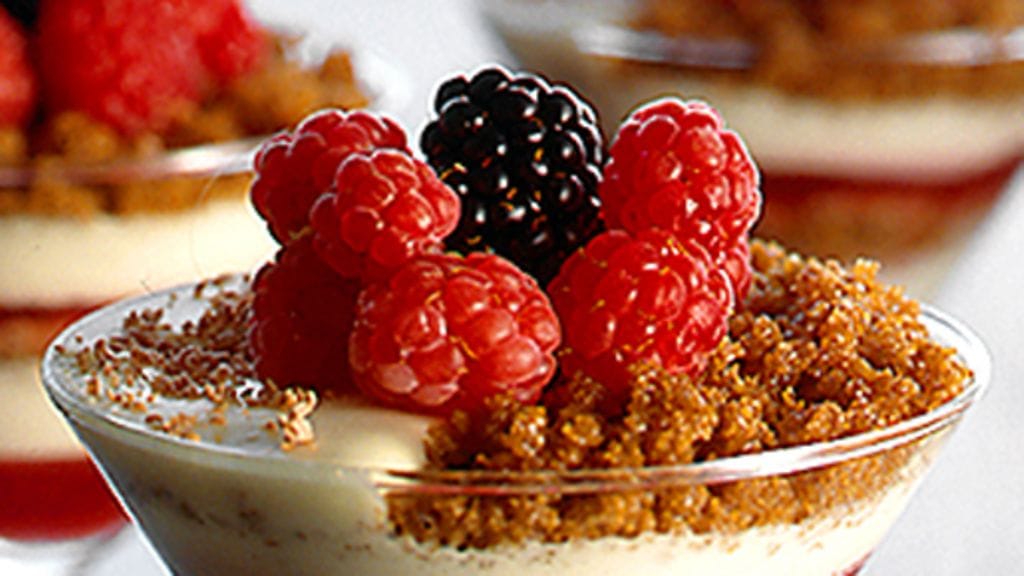 3. Lado kerroksittain keksinmuruja, vadelmatahnaa ja rahkaa kauniisiin laseihin. Laita päällimmäiseksi muruja, koristele tuoreilla marjoilla.