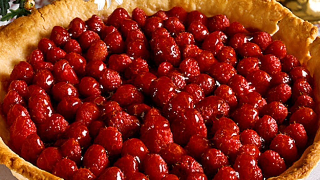 4. Sulata hyytelö viinin kera ja vatkaa sileäksi. Asettele vadelmat piirakalle ja lusikoi hyytelö päälle.