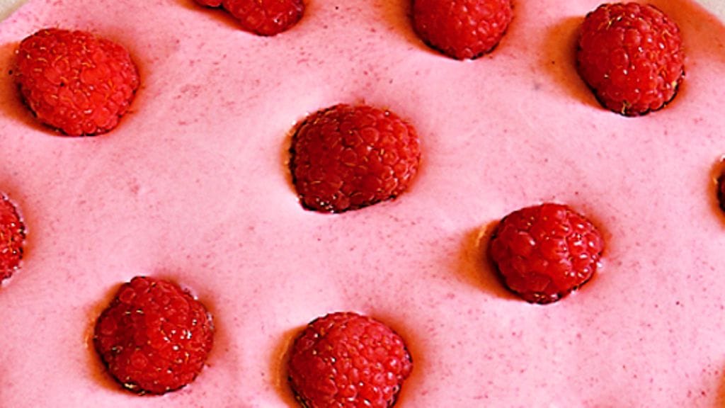 2. Vaahdota kerma kiinteäksi, sekoita yhteen vadelmasoseen kanssa ja siirrä vaahto tarjoilukulhoon.