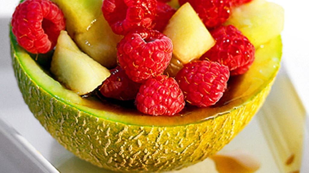 3. Lado melonia, vadelmia ja sokeria meloninkuoriin. Pirskottele päälle portviini. Säilytä kylmässä tarjoiluun asti.