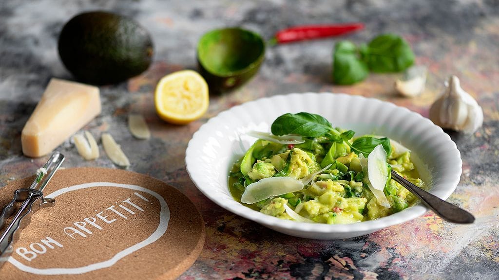 - Mittaa kulhoon oliiviöljy. Kuori ja hienonna valkosipulinkynsi. Hienonna chilipaprika. Puolita avokado ja koverra hedelmäliha. Hienonna haarukalla. Raasta joukkoon parmesaanijuustoa ja purista joukkoon vielä limen tai sitruunanmehu. Sekoita ainesten joukkoon ripaus suolaa. Kaada joukkoon kesäkurpitsasuikaleet ja kääntele.
