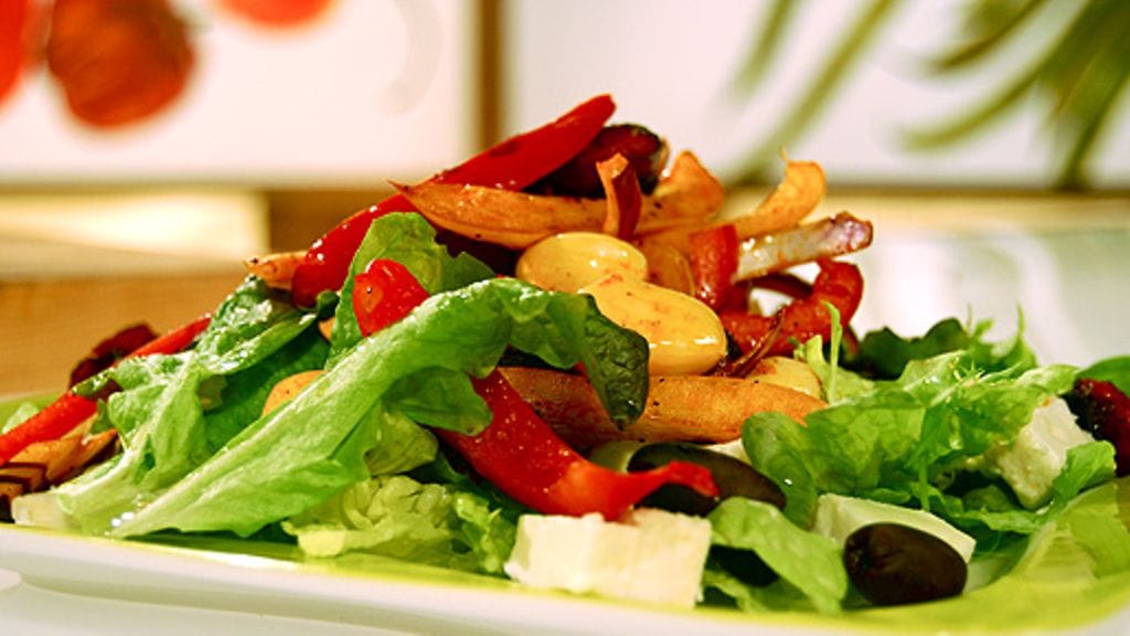 Anna hetki jäähtyä ja nosta sen jälkeen lämpimät ainekset salaatin päälle Leikkaa lopuksi feta-juusto sekä oliivit joukkoon ja koristele salaatti niillä.