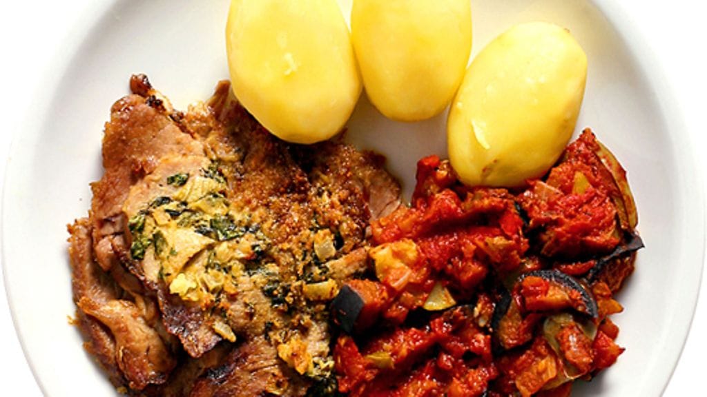 2. Ratatouille: Kuori ja paloittele sipuli. Kuutioi munakoiso, kesäkurpitsa ja paprika isoiksi kuutioiksi. Paista sipuli oliiviöljyssä. Lisää munakoiso, kesäkurpitsa, paprika ja tomaattimurska. Puserra mukaan valkosipuli ja mausta timjamilla, laakerinlehdellä, suolalla ja pippurilla. Anna poreilla miedolla lämmöllä 30 minuuttia. Hienonna basilika ja lisää se ratatouilleen ennen tarjoilua.