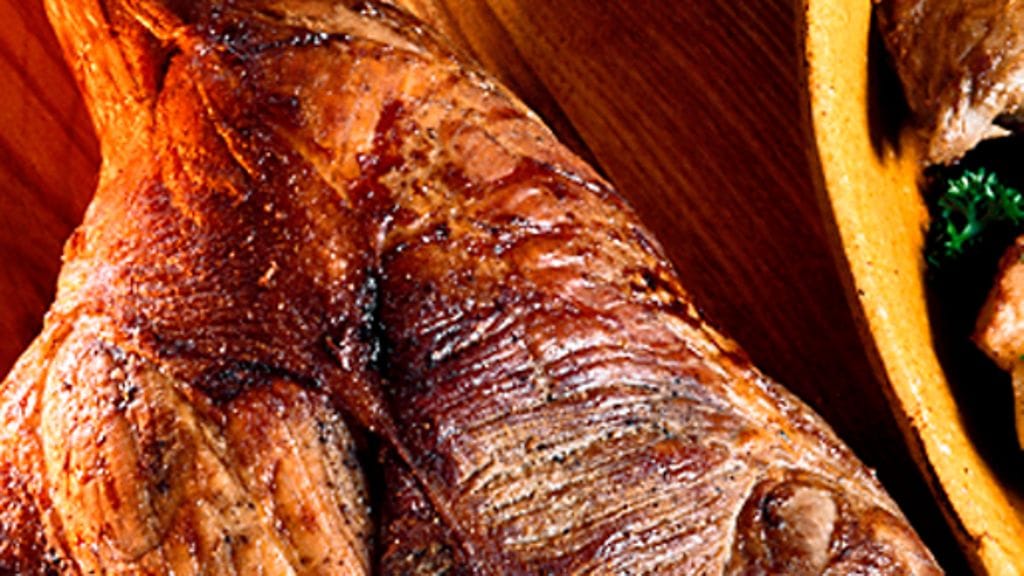 1. Kuumenna uuni 175 asteeseen. Pistele veitsenkärjellä reikiä paistiin sinne tänne ja työnnä reikiin valkosipulinpaloja. Hiero liha hyvin suolalla, pippurilla ja lopuksi mintulla. Laita liha ritilälle uunipannun päälle.