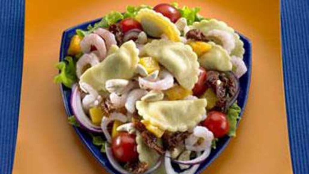 Viipaloi muut aineet. Valuta ravut, mikäli käytät pakastekatkarapuja. Asettele ainekset isoon salaattikulhoon tai pienempiin annoskulhoihin kerroksittain kauniisti. Sekoita kastike, tarkista maku ja valuta salaatin joukkoon, koristele.
