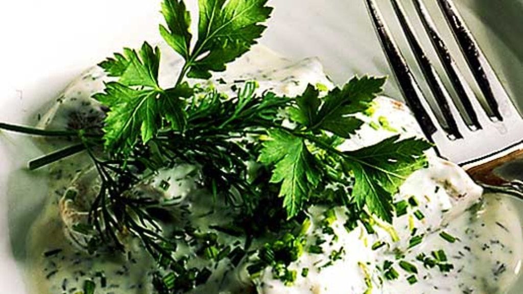 2. päivä: Sekoita majoneesi ja kermaviili. Hienonna tilli, ruohosipuli ja persilja. Purista joukkoon valkosipuli. Mausta vastajauhetulla valkopippurilla.