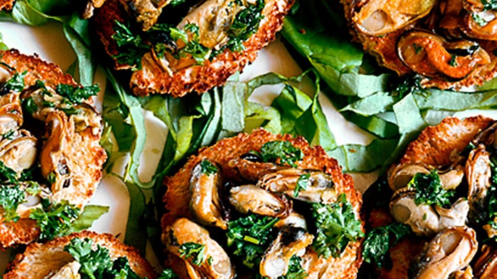 Nopea ja helppo, valkosipulilta ja persiljalta maistuva alkuruoka, joka valmistetaan purkkisimpukoista.