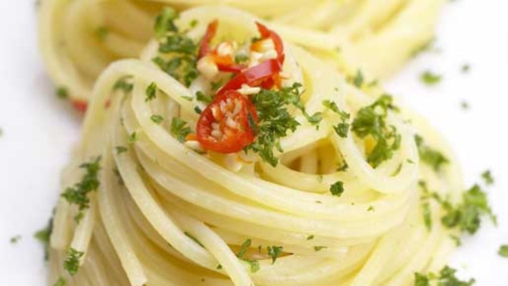 - Lisää spaghetti pannuun, jossa on oliiviöljy, valkosipuli ja chilipippuri ja sekoita hyvin. Estääksesi kuivumista lisää muutama kauhallinen pastavettä. Anna kiehua muutama minuutti tai kunnes pasta on sopivan kypsää.