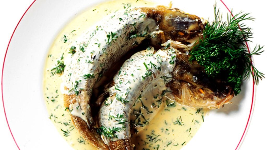 3. Nosta kalat varoen kattilasta ja pidä ne lämpimänä alumiinifolion alla. Kaada kerma kattilaan ja keitä kaikki sopivan sakeaksi, tai suurusta massalla, johon olet sekoittanut yhtä paljon voita ja jauhoja. Mausta kastike ripauksella suolaa. Asettele kalat lämpimille lautasille ja kaada kastike päälle.