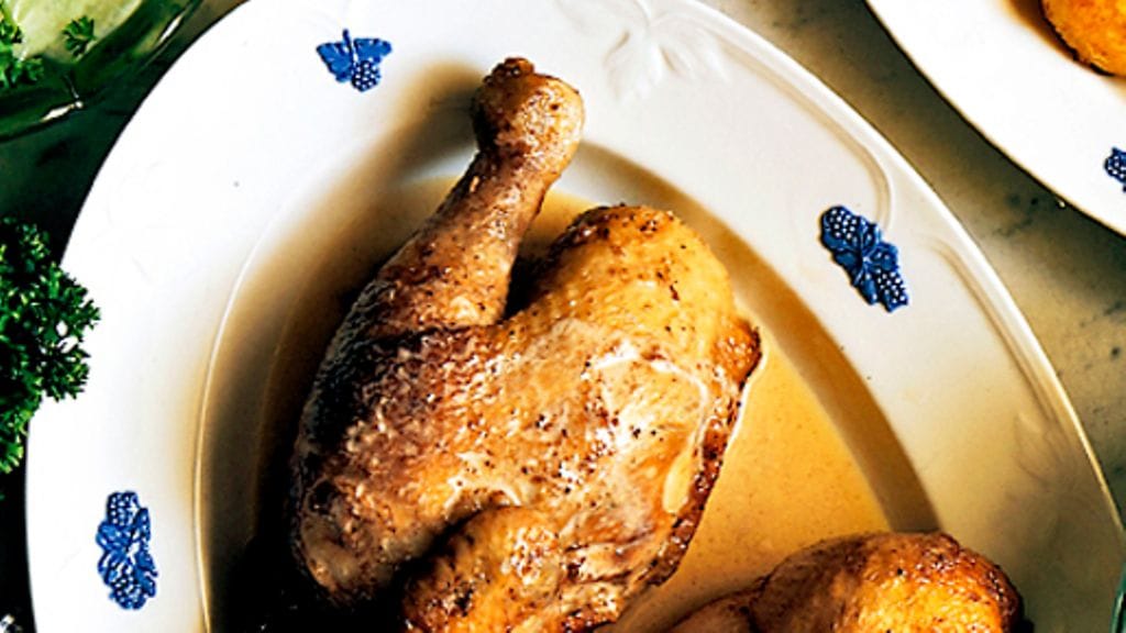 1. Mausta broilerinpuolikkaat suolalla ja pippurilla. Ruskista ne kauttaaltaan voissa paistokasarissa.