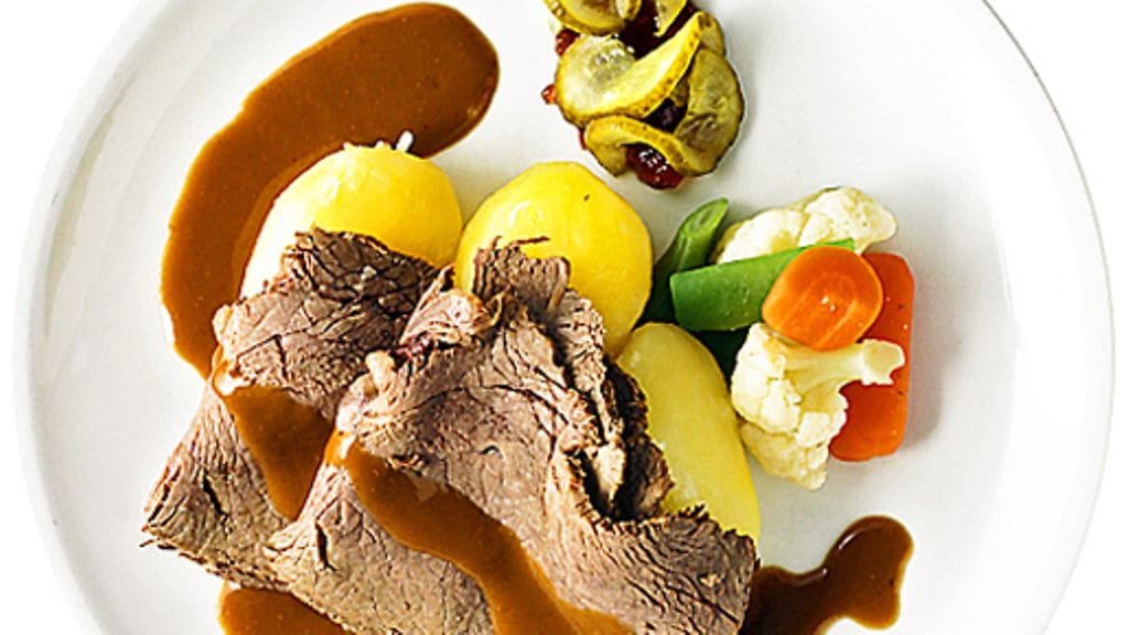 1. Ruskista paisti joka puolelta voissa. Laita liha pataan, mausta suolalla ja pippurilla. Kuori sipulit ja porkkanat ja paloittele ne. Laita sipuli, porkkana, pippurit, laakerinlehti ja anjovis paistin ympärille, lisää viinietikka ja siirappi. Lisää vesi hieman kerrallaan ja jälkipaista kannen alla miedolla lämmöllä noin 1 ½ tuntia. Nosta paisti padasta.