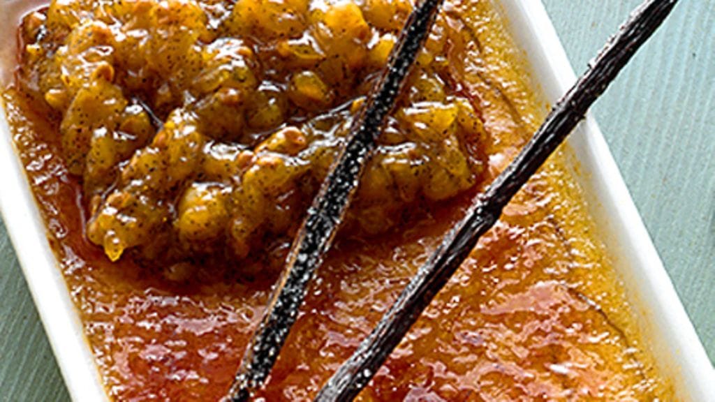 3. Ripottele päälle ruokosokeria ja laita grillivastuksen alle 250-asteiseen uuniin n. 2 minuutiksi tai kunnes sokeri on sulanut ja on ruskeaa ja kuplivaa. Laita loput lakkaseoksesta päälle, tarjoile heti.