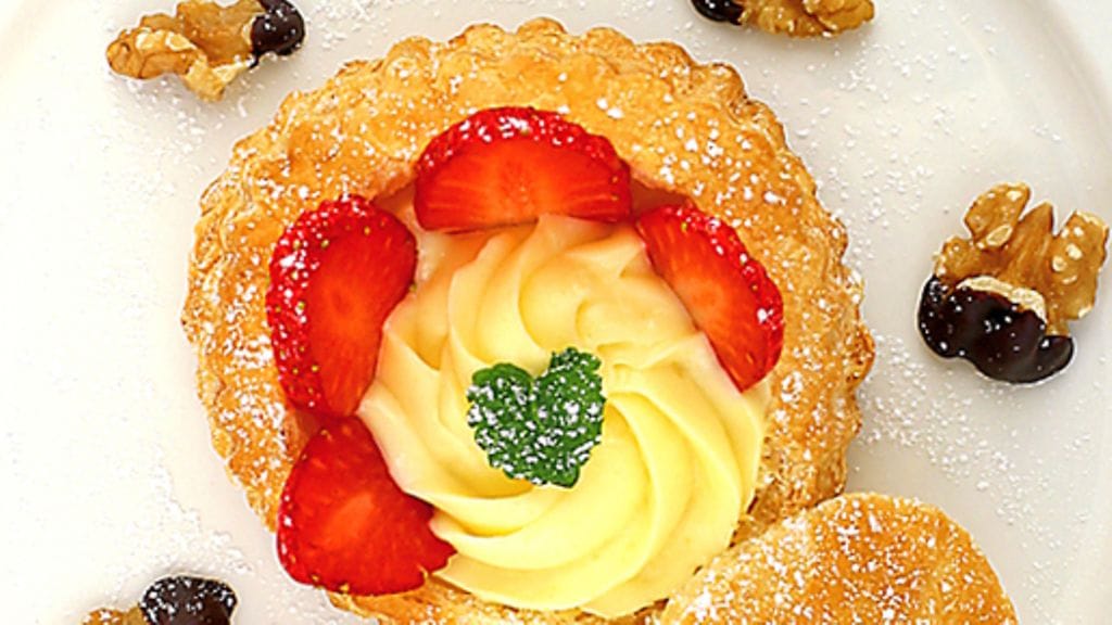 3. Sulata suklaa vesihauteessa. Kasta saksanpähkinät suklaaseen, anna jähmettyä voipaperilla. Kuumenna uuni 275 asteeseen. Lämmitä voitaikinavuoat uunissa kaksi minuuttia. Irrota kannet. Täytä vaniljakreemillä, koristele mansikoilla ja suklaapähkinöillä. Tarjoile heti.